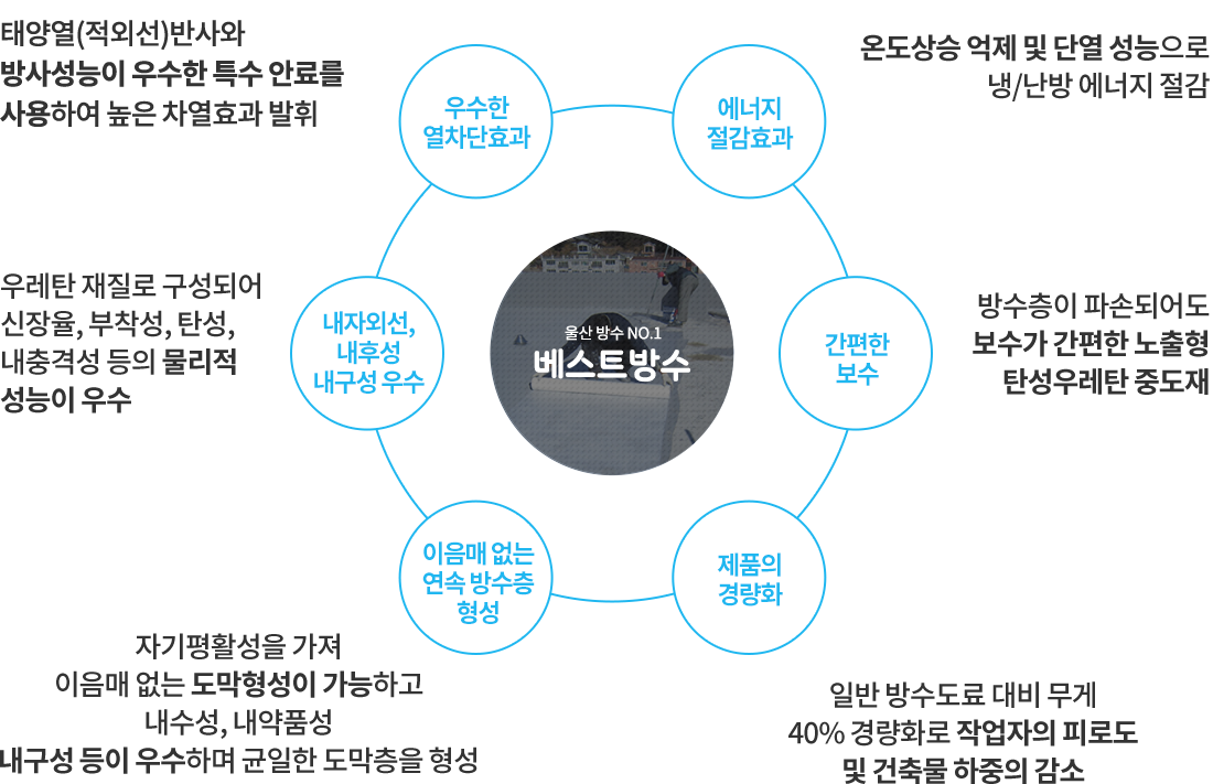 방수도막 표현에 도달하는 태양광을 반사시켜 열의 침투를 막습니다.